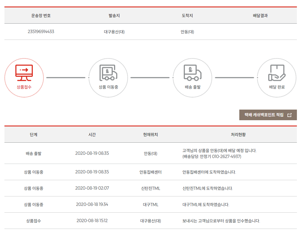 입력을 하실 때에는 남다른 기호는 활용하지 마시고, 숫자만 입력해 주셔야지만 순조로운 택배조회가 가능해요. 입력한 송장번호를 통해 현재 택배의 실시간 스팟을 찾아볼 수가 있고요. 흔하게 상품 접수-상품 이동 중-배송 출발-배달 완료의 순서에 따라서 이루어지기 때문에 현재 택배의 상태가 어떤지 바로 체크가 가능해요.