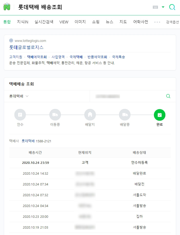 롯데글로벌로지스 홈페이지에서 운송장 번호와 택배예약 번호를 통해 롯데택배 배송조회 상세 스팟체크가 가능해요. 운송장 번호, 발송지, 안착지, 배달결과를 체크하실 수 있습니다. 아직 배달이 되지 않으신다면 이동중이라고 체크될 것이며 배달이 되었으면 배달완료라고 나올 것이예요.