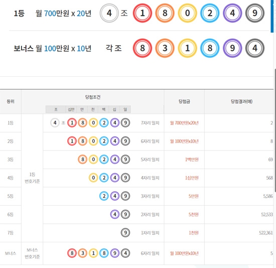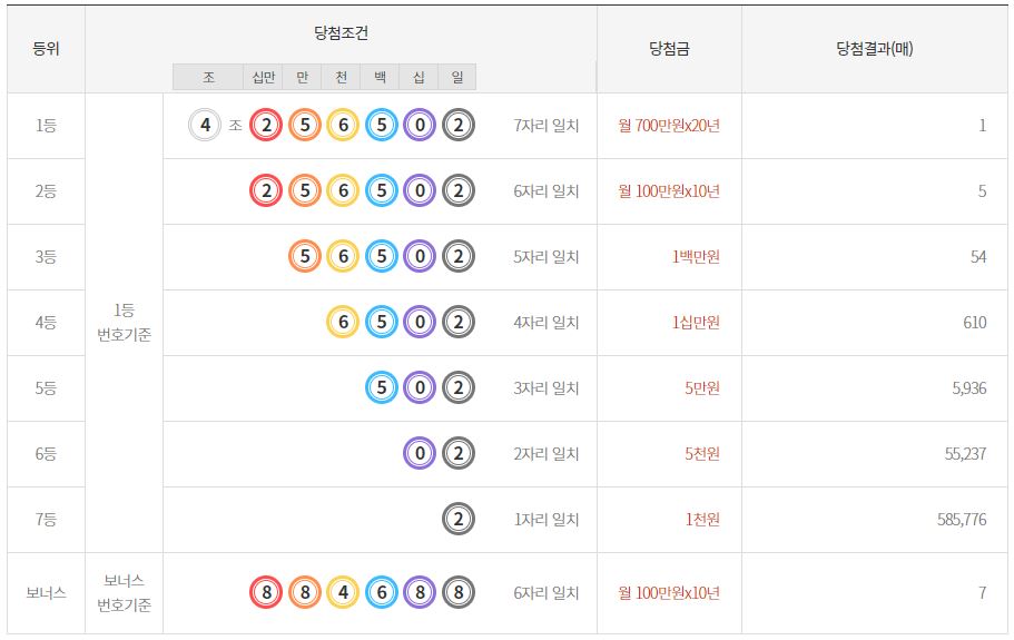 당첨순위는 1등~7등, 그리고 보너스번호가 존재해요. 1등은 조를 포함 나머지 숫자들까지 모두 맞춰야합니다. 또한 2등은 조는 맞지 않고 나머지 숫자 6자리를 모두 맞춘 경우고요. 또한 보너스번호는 도대체 다른 별개의 보너스번호 6자리를 모두 맞춘 경우이예요.
